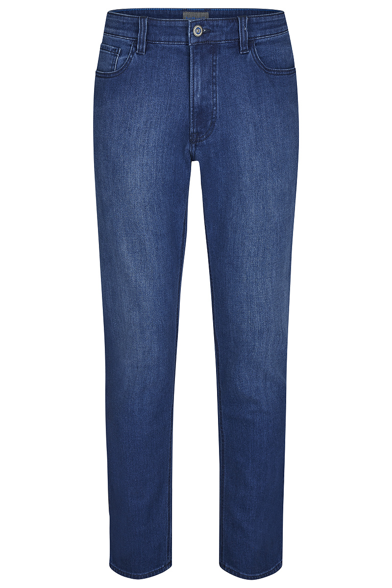 Die hattric Jeans 5-Pocket Hunter der aktuellen Kollektion hat eine Ringstruktur in authentischer Used-Waschung. Dank der bequemen Passform hat die Herren Jeans einen hohen Tragekomfort. Dank des Baumwoll-Viskose-Mix der hattric Jeans ist sie feuchtigkeitsregulierend. Das Material besteht zu 69 % aus Baumwolle, zu 27 % aus Polyester, zu 3 & aus Viskose und zu 1 % aus Elasthan. Der Viskose-Anteil macht die Herren Jeans hautfreundlich. Ergänzt wird der moderne Stil der Jeans durch zwei geschwungene Vordertaschen, eine Coin Pocket und zwei aufgesetzte Gesäßtaschen. Das Modell 5-Pocket Hunter ist formbeständig und langlebig.