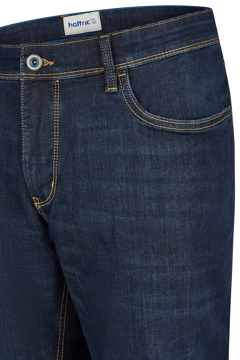 Die hattric Jeans in der Passform Regular Fit ist das ultimative Must-have für Herbst und Winter. Mit ihrem kernigen Griff und der genauso strapazierfähigen wie weichen Qualität aus Baumwolle, Polyester, Viskose sowie einem Hauch Elasthan macht die Herrenhose auch bei Schmuddelwetter alles mit. Ihr optimaler Sitz zaubert eine stilvolle Silhouette und ist super bequem. Toll zu Sweatshirts und Strickpullis, aber auch zu rustikalen Flanellhemden! Auch die Details können sich sehen lassen: Die 5-Pocket Denim Herrenhose bringt die typischen Einschubtaschen mit extra Coinpocket mit und verfügt im hinteren Bereich über aufgesetzte Gesäßtaschen. Ziernähte in dezenten Kontrastfarben runden das markante Erscheinungsbild der hattric Jeans ab.